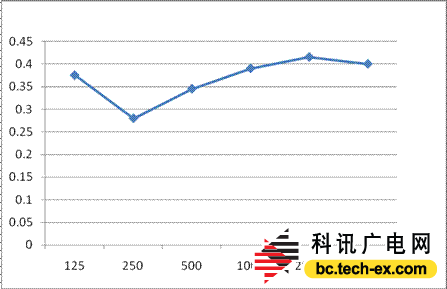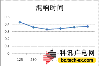 圖12為控制室混響時(shí)間曲線測量結(jié)果,相對于錄音棚來說較為平直,主要混響時(shí)間在0.35S-0.4S之間,只有250Hz混響時(shí)間低于0.3s,可能是由于房間內(nèi)家具共振吸聲或者是房間低頻吸聲控制產(chǎn)生的問題。