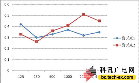 圖13為控制室兩個(gè)測試點(diǎn)的混響時(shí)間曲線,從圖中可以看出調(diào)音臺(tái)錄音師位置的混響時(shí)間曲線較為平直,主要集中在0.3-0.35s附近,只是在125Hz附近有0.42s的混響時(shí)間,可能是隔聲窗的反射面共振所致。而在控制室中心位置高頻混響時(shí)間較高,中低頻部分與測試點(diǎn)1類似,而高頻部分相對較高,有可能為房間內(nèi)家具及柜子玻璃的反射面所致,原因需要進(jìn)一步排除才能確定。