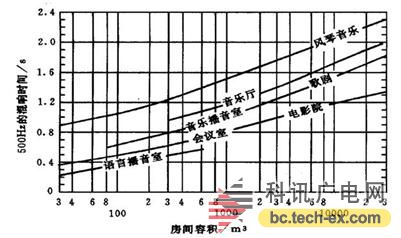 對混響時(shí)間進(jìn)行計(jì)算,由此可見混響時(shí)間和建筑物的體積V,房間吸聲材料的平均吸聲系數(shù)