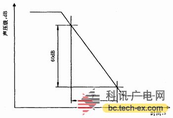 混響時(shí)間反映了室內(nèi)聲能的衰變快慢,它是由100多年前美國物理學(xué)家賽賓提出的,指的是當(dāng)聲源在房間內(nèi)停止發(fā)聲后,殘余聲能在房間內(nèi)往復(fù)反射,其密度衰變60dB所需的時(shí)間,如圖1所示。我們可以通過賽賓公式