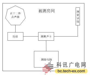 通過上面我們對混響時(shí)間的了解,利用脈沖響應(yīng)積分法進(jìn)行測量,其系統(tǒng)可分為聲源、測試話筒、測量軟件三部分,如圖2所示,為脈沖響應(yīng)積分法測量混響時(shí)間的測試系統(tǒng)圖。聲音信號(hào)通過電腦經(jīng)聲卡由正十二面體點(diǎn)聲源揚(yáng)聲器發(fā)出,通過對房間的激勵(lì)在測量點(diǎn)由測量話筒記錄到電腦,經(jīng)專業(yè)測試軟件進(jìn)行數(shù)字信號(hào)處理,最終獲得混響時(shí)間。為了更好地激勵(lì)房間的聲學(xué)特性,通常測量時(shí)對聲源及話筒有一定的要求,其中揚(yáng)聲器的指向性應(yīng)盡可能接近全指向,且可以提供足夠的聲壓級來滿足聲壓衰減的動(dòng)態(tài)要求,同時(shí)對于測量話筒來說振膜越小越好,最大直徑不能超過26mm。