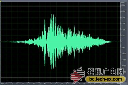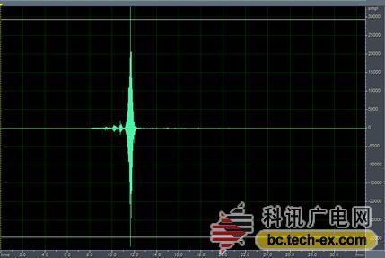 圖3為掃頻信號(hào),作為房間激勵(lì)的噪聲信號(hào),頻率為20Hz-20KHz時(shí)長為10s,通過該信號(hào)與自身的卷積可以獲得脈沖信號(hào),如圖4所示,從圖中可以看出經(jīng)計(jì)算得出的脈沖響應(yīng)上升沿陡峭,比直接利用電火花或者扎氣球等方法獲得的脈沖響應(yīng)頻帶寬且信噪比高。