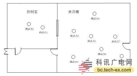 對于話筒測量點(diǎn)數(shù)量方面,通常需要尋找房間里具有代表性的觀眾位置,特別是靠近墻面座位或者包廂的下面,話筒高度距地面通常在1.2米左右,此高度與大部分觀眾坐下時(shí)耳朵距地面高度相同。對于工程噪聲為目的的混響時(shí)間測量,話筒測量點(diǎn)可以在觀眾區(qū)域中心附近布置相對較少的三到四個(gè)點(diǎn)即可。若是對于廳堂混響設(shè)計(jì)為目的的測量,通常要根據(jù)房間聲學(xué)環(huán)境的復(fù)雜程度,選擇一定數(shù)量具有代表性的測量點(diǎn)。同時(shí)對于聲源的發(fā)聲位置來說也要根據(jù)廳堂日常使用的情況來進(jìn)行變更,通常放置在日常經(jīng)常發(fā)聲的位置,類似舞臺(tái)、樂池等位置,針對不同的發(fā)聲位置和使用目的進(jìn)行靈活布點(diǎn)。如圖9所示,首先測量了用戶反應(yīng)較為不理想的區(qū)域,例如錄音棚內(nèi)測試點(diǎn)1-5,同時(shí)為了反映整個(gè)錄音棚的平均聲學(xué)特征,在測量時(shí)另外增加了測試點(diǎn)6-7點(diǎn)。其次對控制室錄音師位置以及房間中心位置進(jìn)行測量,以獲得控制室的混響時(shí)間頻域特征。