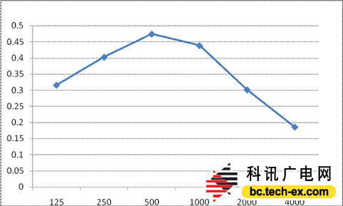 通過測量錄音棚的混響時(shí)間曲線如圖10所示,從圖中可以看出房間在2000Hz-4000Hz之間混響時(shí)間較短,分別為0.3S和0.18S,同時(shí)在125Hz及250Hz的混響時(shí)間也相對較短,分別為0.3S及0.4S,在中頻500Hz、1000Hz有著相對較多的混響時(shí)間。從整體上看該房間的混響時(shí)間特性存在一定的問題主要表現(xiàn)在高頻吸聲過多,中頻混響時(shí)間過于突出,勢必影響到主觀的聽覺感受,其本底噪聲在關(guān)燈及關(guān)門的情況下測得為35.5dBA。