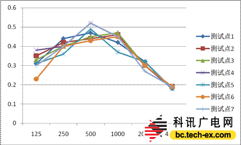 圖11為錄音棚內(nèi)各個(gè)測試點(diǎn)的混響時(shí)間曲線,從整體來看7條曲線整體趨勢基本相同的,特別是在2000Hz-4000Hz之間有著非常接近的曲線擬合。其中測試點(diǎn)7在500Hz偏離較大,主要原因可能在于測試點(diǎn)門及譜架等反射面形成的低頻駐波所引起的共振。