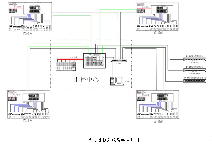 其它需要實(shí)時(shí)播出信號(hào)的部門(mén),諸如錄制機(jī)房、網(wǎng)絡(luò)播出機(jī)房、有線播出機(jī)房、審聽(tīng)間等,可以通過(guò)DHD路由控制單元使用網(wǎng)線直接連至主控中心的光纖交換矩陣(見(jiàn)圖3中DHD路由控制單元的連接),來(lái)獲取所需的播出信號(hào)。