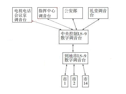 首先在信號匯集點(diǎn)圖像控制中心放置兩臺LS-9,其中一臺用來匯集各個會場以及公安部的音頻信號,另一臺用來接收和發(fā)送各市的音頻信號;其他每個會場放置一臺普通的調(diào)音臺即可,用于與中心交換音頻信號,如圖1所示。