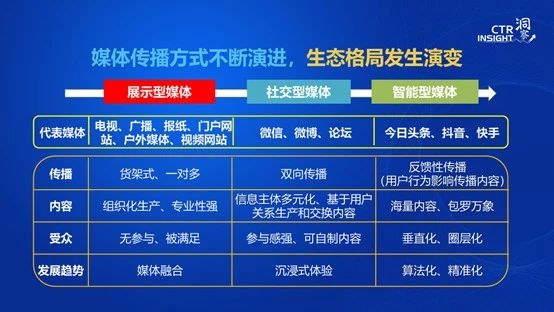 這種類型是以頭條系、抖音和快手為代表的短視頻平臺(tái)。其典型的特點(diǎn)是反饋式傳播,根據(jù)受眾的畫像、受眾以往的行為特點(diǎn)形成算法,精準(zhǔn)推送。這種媒體就可以做到千人千面,這是跟以往媒體不一樣的。
