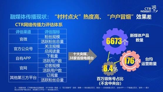 2018年,CTR對(duì)38家電視臺(tái)、十大央媒的融媒體傳播力進(jìn)行了盤點(diǎn),形成了CTR網(wǎng)絡(luò)傳播力評(píng)估體系。在針對(duì)五大渠道的評(píng)估體系當(dāng)中,我們把主要央媒和電視臺(tái)的新媒體產(chǎn)品進(jìn)行了梳理,發(fā)現(xiàn)賬號(hào)數(shù)量達(dá)到6000~8000個(gè),數(shù)量非常巨大,臺(tái)均運(yùn)營(yíng)數(shù)量176個(gè)。