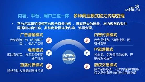內(nèi)容、平臺(tái)、用戶三位一體,發(fā)展出多種商業(yè)模式助力內(nèi)容變現(xiàn)。以往媒體僅僅是依靠廣告進(jìn)行變現(xiàn),現(xiàn)在短視頻借助一系列技術(shù)手段不僅可以通過(guò)廣告變現(xiàn)(廣告依然是其重要的盈利模式),還可以通過(guò)帶貨方式如電商模式變現(xiàn),通過(guò)打賞如直播付費(fèi)模式變現(xiàn),此外也可以通過(guò)版權(quán)交易模式變現(xiàn)等。
