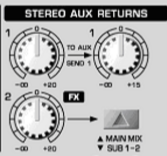 STEREO AUX RETURN 1調節(jié)鈕是立體電位計。用它來確定主混音上輸入信號的音量。如果您將此輸入端用作效果回路,則將效果信號混入聲道的”干”信號。