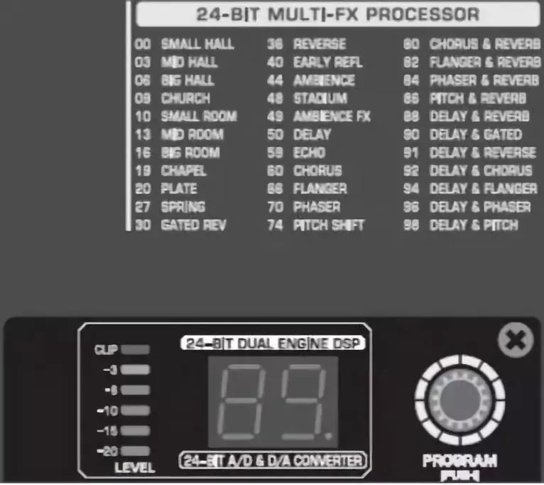 調音臺提供了一套24-BIT MULTI-FX PROCESSOR多重效果處理器。這個內置的效果模塊提供高質量的標準效果,如廳堂、合唱、鑲邊、回聲以及各種組合效果。