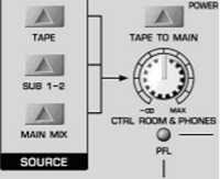 如果按下了CD/TAPE TO MAIN開關,雙軌輸入端便接到主混音上。這樣CD/TAPE INPUT 可被用作磁帶音源輸入、MIDI 樂器或其他不需加工的信號源的附加輸入端。TAPE TO MAIN 開關同時用來分離Main Mix 與CD/TAPE OUTPUT 的連接。