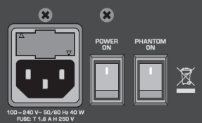 通過PHANTOM 開關您可啟動單聲道XLR 插孔的幻像電源,使用電容式麥克風需要幻像電源。紅色的+48V 發(fā)光二極管發(fā)光時表示幻像電源已接通。如果使用平衡式電線的話,通常還可同時使用動圈麥克風。