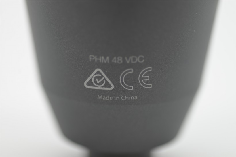 話筒背面的底部位置,寫著PHM 48VDC,就是該話筒需要48V的幻象電源驅動的意思,下面還有CE認證等,再下面印著Made in China一行小字。