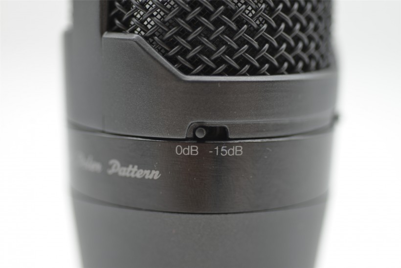 在話筒背面還有兩個開關,分別是-15dB的PAD開關與低切開關。-15dB用于來應對具有超大聲壓級的音源,比如高動態(tài)大聲壓的鼓時,就可以打開這個PAD開關。而低切可以有效減少一些不必要收錄進去的低頻環(huán)境噪音,當然如果你有一定后期制作能力的話可以不需要打開。