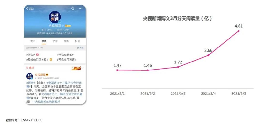 十三屆全國人大四次會議開幕當天,央視新聞微博博文單日閱讀量達到4.61億,較前一天提升73%,單日閱讀量為近兩周新高。