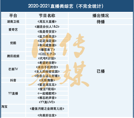 直播帶來的巨大流量為注意力經(jīng)濟帶來很多可能性。一向?qū)τ脩簟α髁坑兄翡J觸角的綜藝市場便和直播自然而然地走到了一起。2020年一年,有20檔左右直播類綜藝出現(xiàn),包括愛騰優(yōu)芒的網(wǎng)綜以及電視媒體的頭部綜藝中,都有涉獵直播元素,直播類綜藝呈現(xiàn)出小爆之勢。