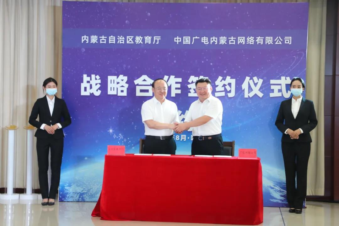 啟動(dòng)儀式現(xiàn)場(chǎng),自治區(qū)教育廳與中國(guó)廣電內(nèi)蒙古網(wǎng)絡(luò)有限公司簽署了教育信息化全面戰(zhàn)略合作協(xié)議,雙方將在宣傳推行使用國(guó)家統(tǒng)編教材、全面提升教育信息化基礎(chǔ)支撐能力、共同構(gòu)建教育內(nèi)容資源體系、推進(jìn)公共教育服務(wù)向農(nóng)牧區(qū)和偏遠(yuǎn)貧困地區(qū)延伸等領(lǐng)域展開(kāi)全面合作。
