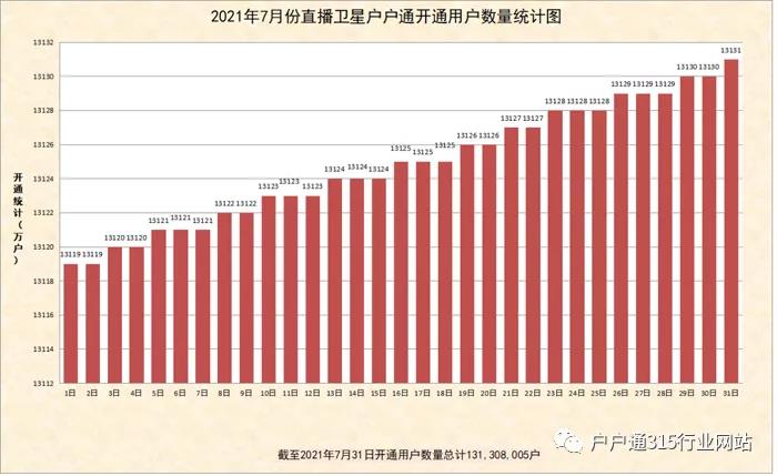 根據(jù)廣電總局發(fā)布的直播衛(wèi)星戶戶通開通用戶數(shù)量統(tǒng)計圖計算,截止2021年7月31日全國戶戶通累計開通用戶數(shù)量13131萬戶(1億3131萬戶),比上月底6月30日的13119新增12萬戶,平均每天開通0.39萬戶,合每天開通3900戶。比上個月的開通數(shù)量速度略有增加。