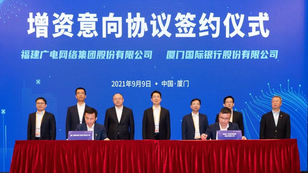 9月9日,福建廣電網絡集團與廈門國際銀行簽訂增資意向協(xié)議,福建廣電網絡集團黨委書記、董事長蔡琳,黨委副書記、總經理黃葦洲,廈門國際銀行黨委書記、董事長王曉健,黨委副書記、行長章德春等領導出席簽約儀式。福建廣電網絡集團總會計師方友愛與廈門國際銀行副行長黃大慶代表雙方進行簽約。