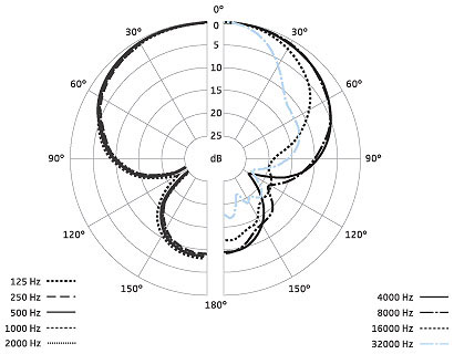 超心形話筒 MKH 8050 對于軸外的聲音給予更大的衰減,相對心形話筒而言。它是對獨(dú)唱者/獨(dú)奏者錄音的好選擇,因?yàn)檫@些要求很高的聲音分離。