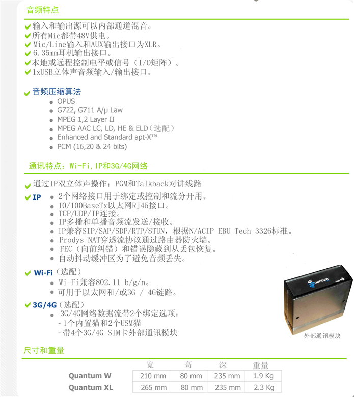 Quantum:從Prodys Ikusnet視頻解碼器家族繼承了世界一流IP技術(shù):自動抖動緩沖、自適應(yīng)比特率、綁定7個IP鏈路(以太網(wǎng)、3G/4G、Wi-Fi)保證最佳音頻質(zhì)量。
