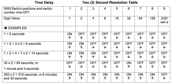 警報延遲時間段是有效音頻失敗到觸發(fā)警報之間的時間。 SilenceSentinel?Standard的警報時間延遲是使用設備背面SW5撥碼開關的前9個位置設置的。下表提供了兩種第二分辨率設置。要提供更長的時間分辨率,請打開SW5開關9,這將提供20秒的分辨率。對于出廠默認設置,如下面的兩秒分辨率表所示,我們已將開關1和2設為ON。每個開關都有一個數字值,如下兩表所示。請遵循下面的兩秒分辨率表。我們將這些數字值相加以獲得總數字值??倲底种党艘苑直媛手担▋擅牖蚨耄┘纯色@得延遲時間。
