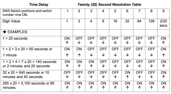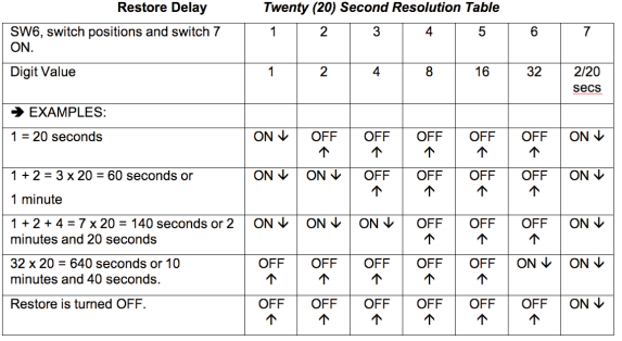 ?撥碼開關選擇恢復時間延遲從OFF到21分鐘,以20秒為增量。