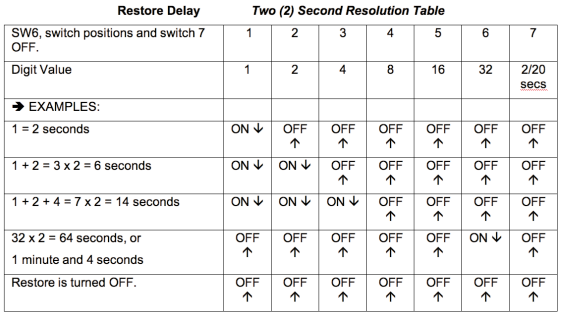 恢復期是從有效音頻返回到清除警報之間的時間。 SilenceSentinel?Standard恢復時間延遲位于設備背面SW6撥碼開關的前7個位置。 上=關,下=開。下表提供了兩種第二分辨率設置。 要提供更長的時間分辨率,請打開SW6開關7,它將提供20秒的分辨率。 所有七個開關在出廠時均設置為OFF,無恢復延遲。 每個開關都有一個數值,如下面的兩個表所示。 請遵循下面的兩秒分辨率表。 總數字值乘以分辨率值(兩秒或二十秒)即可獲得恢復延遲時間。 注意:以下表是指恢復時間延遲(以秒為單位)。