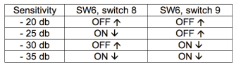 靜音傳感器的跳閘級別從零dBu開始。 撥碼開關SW6上的開關8和9用于設置靜音傳感器跳閘級別。 出廠默認設置為兩個開關均為OFF(-20)。 對于大多數安裝,我們建議將跳閘級別設置為-25。